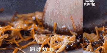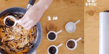 2.锅里放少少油,放入香菇丝、木耳丝、胡萝卜丝、金针菇翻炒