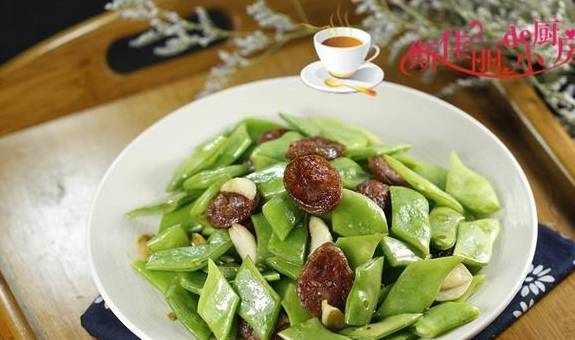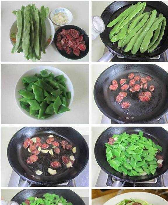 制作:1.准备好原材料;2.烧锅水,加入点几滴油和少许盐,将刀豆放入锅中炒煮;3.焯煮到八成熟后捞出后切成小块;4.锅中放入少许油和水,将腊肠放入锅中煎煮;5.煎至腊肠微微出油后加入蒜片爆香;6.再放入焯好的刀豆进去翻炒;7.加入适量的盐翻炒均匀;8.盛入盘中。