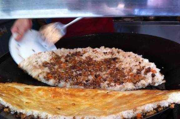 不到一会时间已经起了一锅,马上小伙又把手指贴到锅面试了试温度,然后用一把刷子蘸上熟油刷了下锅面,再将绿豆磨的浆均匀的浇在锅里,再把已经准备好的熟米饭铺到蛋皮上,用小铲子压压,整个面皮看上去有2CM厚的样子。小伙一只手拿着铲把浆铺平,另一只手不停地转动铁锅,这样使豆皮的每个地方都被烘烤到。最后再撒点肉丁和咸菜.放置一会儿又开始翻皮...
