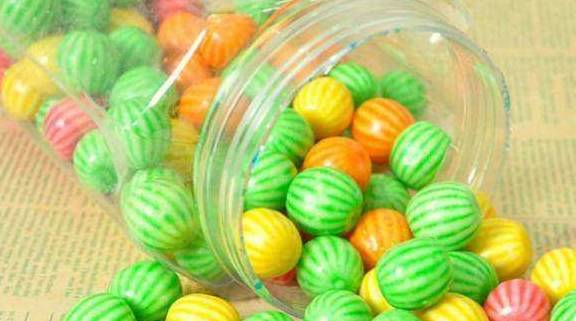 我记得一个桶里面有很多五颜六色的,每颗味道还不一样,里面有酸酸的粉,可以嚼好久,但是一会就嚼硬了。小卖部里一个一个卖的,一个一毛钱呢。