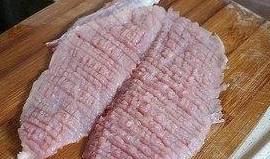 先把猪肉切成1厘米左右的薄片,用刀背敲断经络(十字纹的方法敲)。