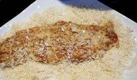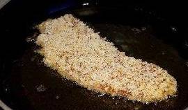 准备一个大的容器,里面倒入面包糠,把猪排从面糊中取出放在面包糠上,用手轻轻的压猪排,使面包糠完全覆盖在猪排上。