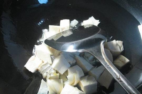 4.烧锅加3汤勺油烧热,下入切好的冬笋翻炒翻炒。