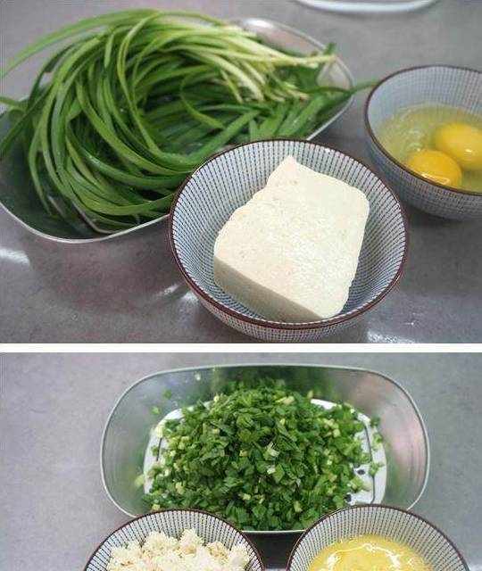 5.韭菜切碎,豆腐用手抓碎,鸡蛋入碗中打散;