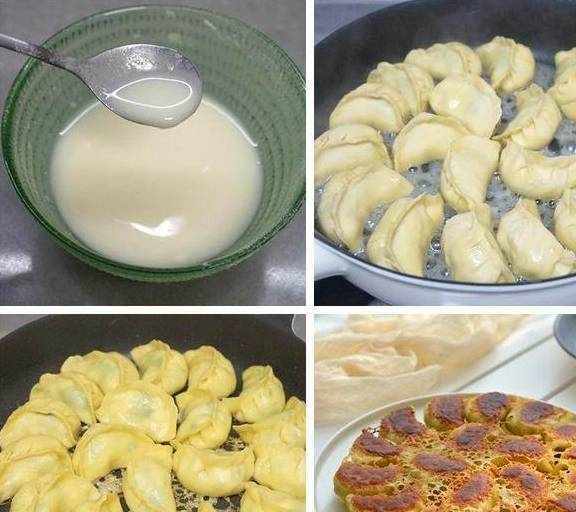 16.开小火,在盛着饺子的煎锅里淋适量油,然后坐火上,此时可调一碗面粉汁做冰花用:两大勺面粉约15克,凉水量约为150克,既要起到稀释面粉的作用,还要能把饺子焖熟;