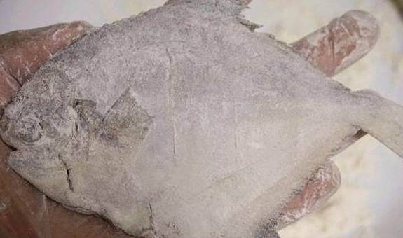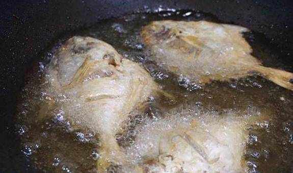 6、等油温六成热的时候再放入平鱼,炸的时候保持中火。直接吃的平鱼,一定炸透,大概3分半的时间。