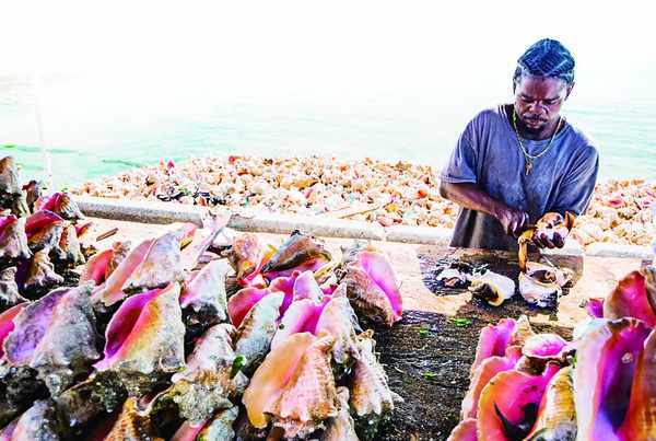 在巴哈马首都拿骚,捕捞和贩卖“女王螺”及各种鱼虾是很多当地人收入不菲的副业。每天清晨,人们会把最新鲜的海螺摆放在鱼市自家的摊位上,每逢顾客光顾,他们会宰杀好后切成海螺片再让客人拿走。通常一磅新鲜海螺的价格约为20美元。