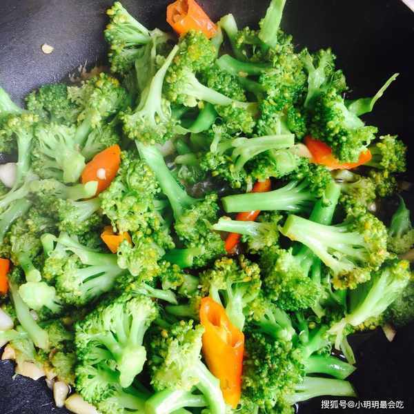 第五步:炒到快出锅了,撒点儿食盐,让西兰花沾上味道,再把调料酱倒进去,拌匀就可以了。