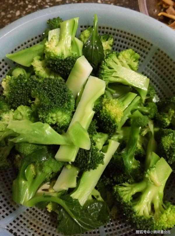 第一步:先把西兰花的粗大根部去掉,再切成适合入口的小块,然后放到锅里中,倒入适量的热水,再倒入半勺粗盐,将西兰花焯水一分钟左右,去除看不见的杂质。注意,煮的时间不能太长,否则西兰花变软,炒的时候就烂了。捞出来之后,用冷水冲一下,沥干水分。注意,焯水一定不能省,一方面可以在后面的过程中更加入味,另一方面是色泽也会变得更好看。