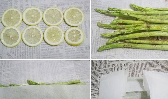4.取一张硅油纸,柠檬片垫底,芦笋放在上面,淋上橄榄油,撒上盐和黑胡椒粉,包好