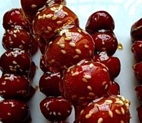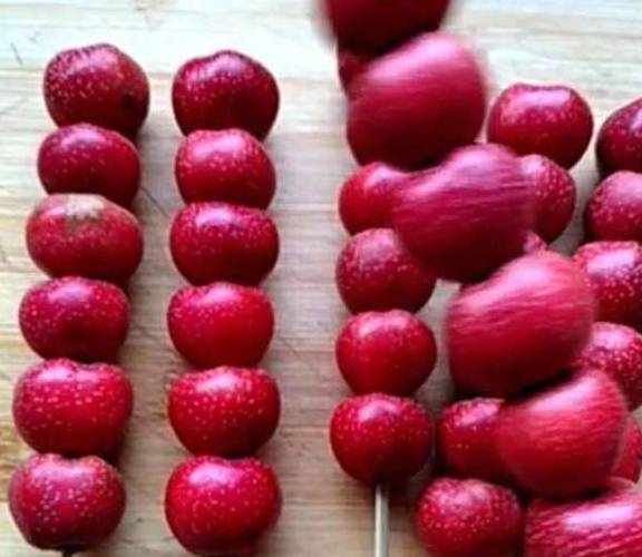 用的最多应该就是山楂了,除了山楂还可以用圣女果、苹果、小桔子,什么水果都可以。用个牙签串起来。