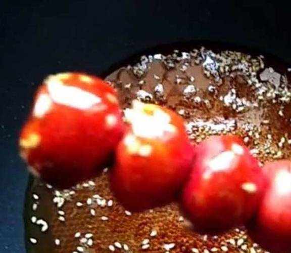 再熬到没有糖泡,在糖里加入一点的熟白芝麻。串好的山楂裹上一层糖。