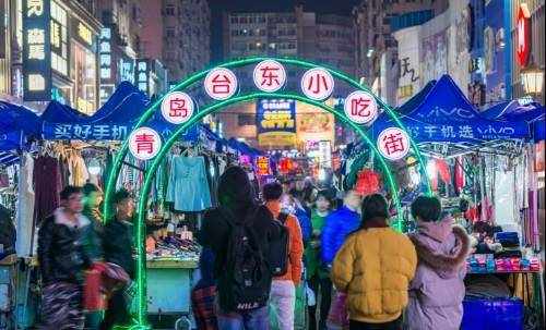 【台东步行街】位于青岛市区的核心地段,全长近一公里路程,大家过来的时候随便从哪一段都能进去;而我们所说的小吃街,就处在商业步行街的最中心,大家可以理解为档口摊贩摆起来的一段夜市,全长大概只有200多米,但却成为了青岛最热闹的小吃街,南来北往的人潮在逛街的时候,都会从小吃街边上经过;