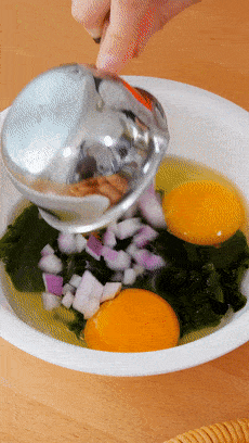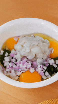 再加上鸡蛋、洋葱、虾仁,它里面蛋白质啊、钙啊、维生素营养都全了,口感也是有保证的!