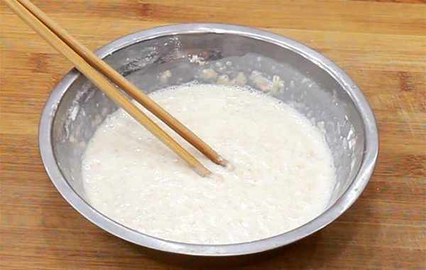 2.准备燕麦片200克,加入纯牛奶100毫升,面粉30克,面粉主要用来增加粘不需要太多,搅拌至没有干面粉,再加入100毫升的清水,调成稀一些的面糊备用。