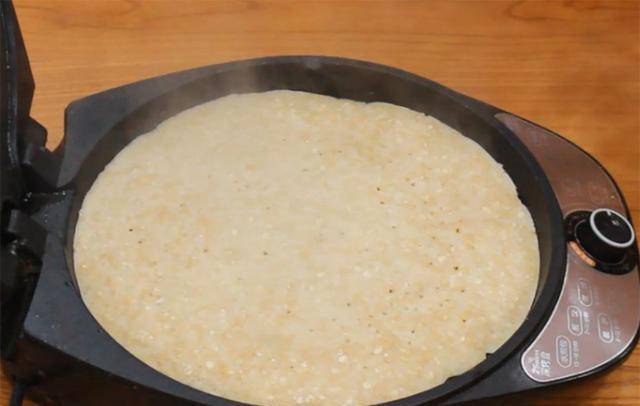 3.起锅开小火,均匀刷上植物油,油温五成热时把面糊倒出锅中,用勺子摊成薄厚均匀的圆形面饼,盖上锅盖烙2分钟。