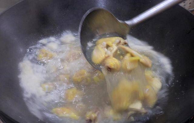 2.锅内烧水,冷水放入鸡块,加入一点料酒去腥,大约煮2分钟,鸡块变色以后倒出来,用清水把上面的血沫洗干净,沥干水分备用。