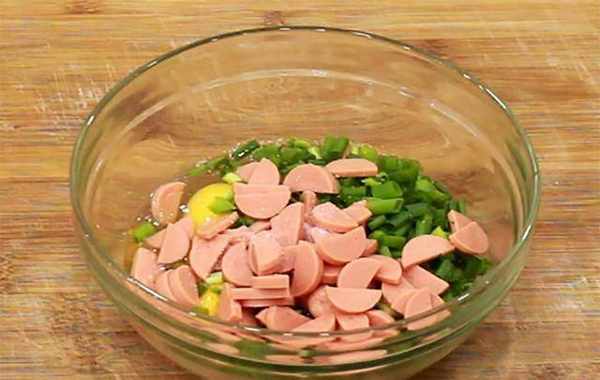 1.在碗中打入三个鸡蛋,切点葱花、火腿片和鸡蛋放在一起,加入食盐2克,搅拌均匀备用。