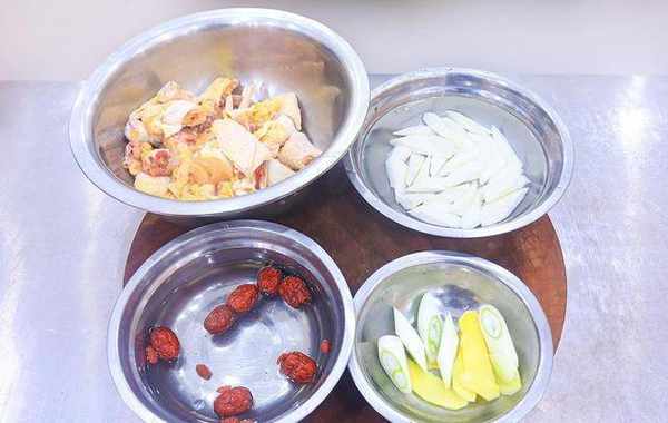 1.准备半只麻鸡,冲洗干净以后剁成均匀的小块;山药一根把外皮削干净,切成滚刀块用清水泡上,再倒入一点白醋防止氧化变色;几粒红枣和枸杞,用清水浸泡一会儿,生姜切成片,大葱切成片,放在一起备用。