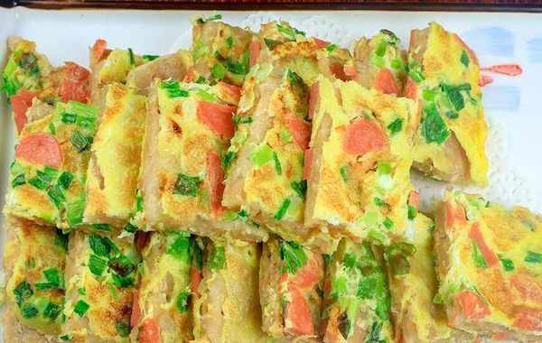 5.时间到再次翻面,保持小火大约烙制5分钟,烙制蛋液全部定型,面呈金黄色时即可出锅,把烙好的饼切成均匀的小块,美味即成。
