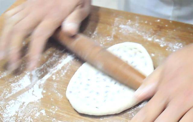 4.红豆晾凉以后在里面放入一勺白糖拌匀备用。把圆面坯摁扁,擀成圆形的面片,在面片上挖入适量的红豆馅,像包包子那样把开口收紧,放在案板上擀成牛舌状。