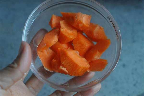 胡萝卜切成小片,便于打碎,小米淘洗干净,红枣去核备用。