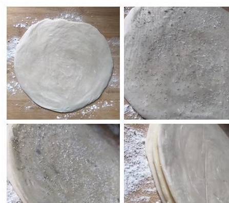 1、案板上撒点面粉,放一张手抓饼,撒上白砂糖,再叠一张手抓饼,继续撒上白砂糖,再摆上第三张手抓饼