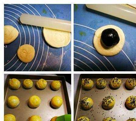 4、用擀面棍擀成薄片,放上蛋黄豆沙,包好,收口朝下放在烤盘中。