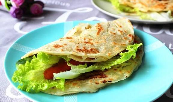 手抓饼普遍的吃法大家都知道,直接拿出来不用解冻,平底锅加热至两面金黄,打鸡蛋,刷酱,放上生菜,裹上肠或者你爱吃的肉,卷起来就可以了。