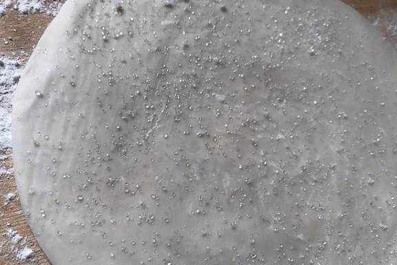 2、等手抓饼稍稍软化后,用擀面棍擀开擀薄,擀好后的面饼继续撒上一层白撒糖(大概大了一倍这样子)