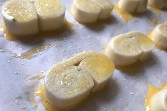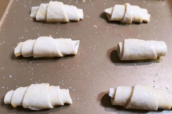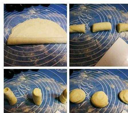 2、在手抓饼上切个W,由宽向窄卷起来,放在烤盘里。(不要卷太紧,要留烘烤膨胀的空间。)
