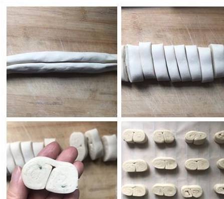 3、两边分别向面饼中间卷起来,用刀切成小块,大小雷同原版蝴蝶酥厚度那样