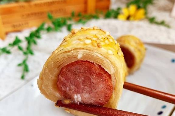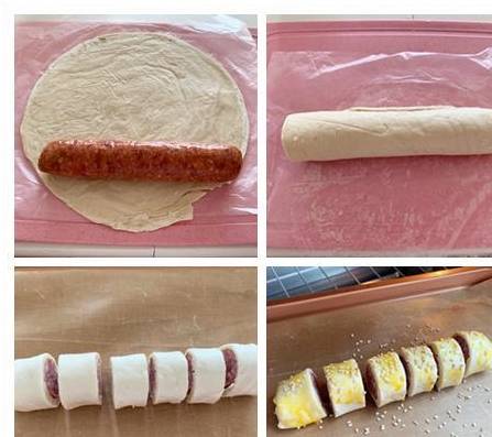 1、手抓饼稍微软化,放上牛肉肠卷起来,用锯齿刀切块
