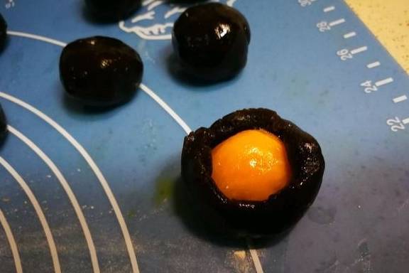 2、将豆沙分成20g/个,搓圆压扁,放上冷却的咸蛋黄。包好,收口,待用。
