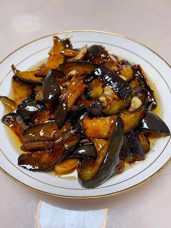 茄子2根、干辣椒3个、宴友食用油、大蒜适量、素油适量、猪油适量、盐适量、糖适量、酱油适量、水适量