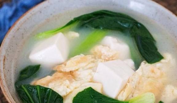 青菜两颗,鸡蛋两个,内脂豆腐一盒,今天的汤只用到半盒的内脂豆腐,煮出来的汤刚好喝两个喝。人多的话可以全部放进去,多加一些水和青菜。