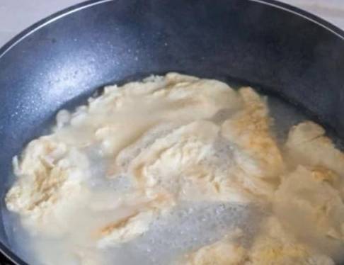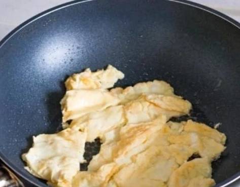 第二步为:两个鸡蛋磕在碗里搅拌均匀,起锅放少量的食用油,倒入鸡蛋液,煎至一面成型之后,再翻面煎至上色,用锅铲铲碎。