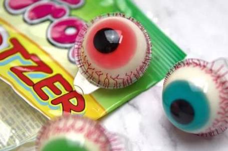第4种就是这种看起来像眼球一样的糖了,看起来好像是真的眼球一样,而且把它切开以后,里面还会爆出红色的浆,味道吃起来就跟普通的软糖差不多,并不是很难吃,但是就是让人有点接受不了,能够吃下去的,肯定不是吃货就是狠人。