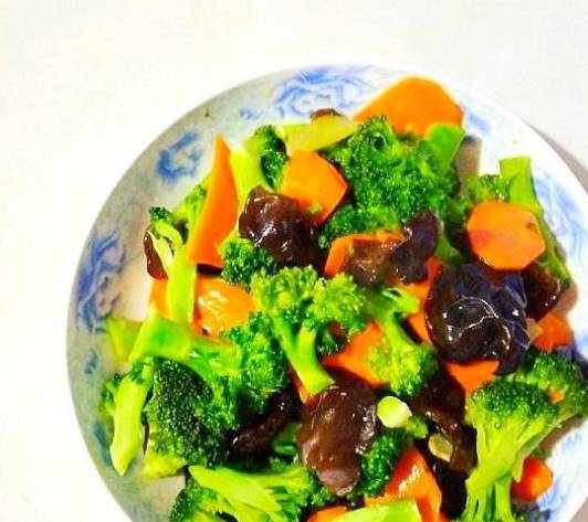 4、锅中放油,加蒜末炒香,炒香后加入红萝卜片翻炒,接着把木耳、煮好的西兰花,盐翻炒均匀,然后再加一点水继续翻炒,炒熟后即可装盘出锅啦。