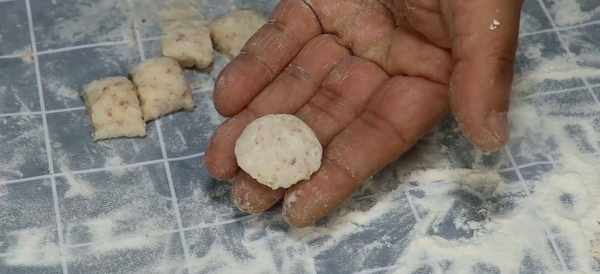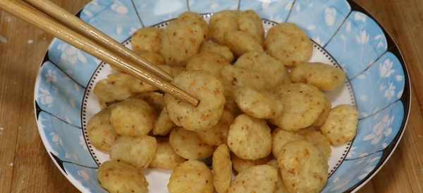 4、将刚炸好的汤圆放入汤圆中,然后用手将汤圆和汤圆揉在一起。揉捏的时候还要在手上抹上食用油,防止它们粘在手上。.这个时候我们小酥的主体就做好了,接下来我们就可以开始调味了。