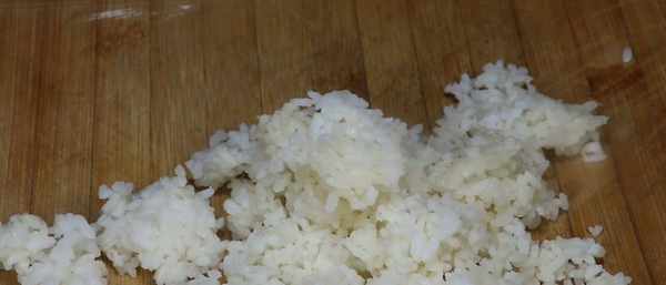 2.先把准备好的剩米饭拿出来放在碗里待用,然后把保鲜膜拿出来,撕下一块保鲜膜铺在一块大板上,然后排列均匀,然后把剩饭倒进去米饭放在保鲜膜上,用保鲜膜把米饭完全包起来。包好后,我们拿出擀面杖,把米饭压紧,压碎,然后盛到盘子里待用。