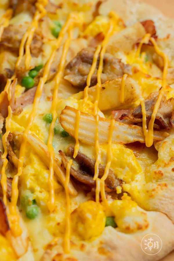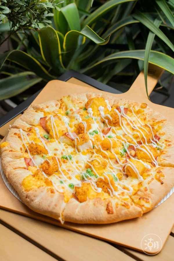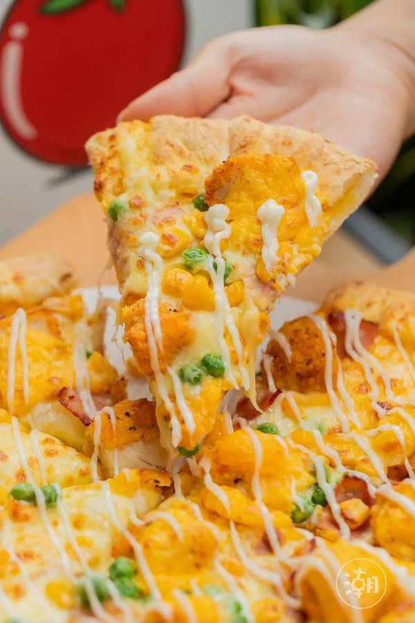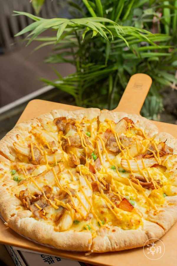 潮妹儿要吹爆金沙咸蛋黄嫩鸡比萨,大家看图就知道很好吃的程度!嫩嫩的鸡肉大块大块地铺满比萨,外层酥脆干香,内里鲜嫩多汁。