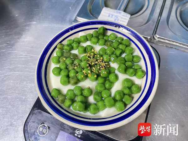 李女士是该店的厨师长,她向记者介绍:“完成一碗青团冰豆花的标准是一百五十克左右的冰豆花,加上六十克左右的青团,然后撒上些许的桂花。”记者了解到,该店“糯叽叽青团冰豆花”中的青团是从供货商那里购入的成品袋装青团,“用150克的豆花粉与1050克的热水一起冲泡,搅匀然后静置三小时。凝固之后,豆花就算完成了。”李女士说。