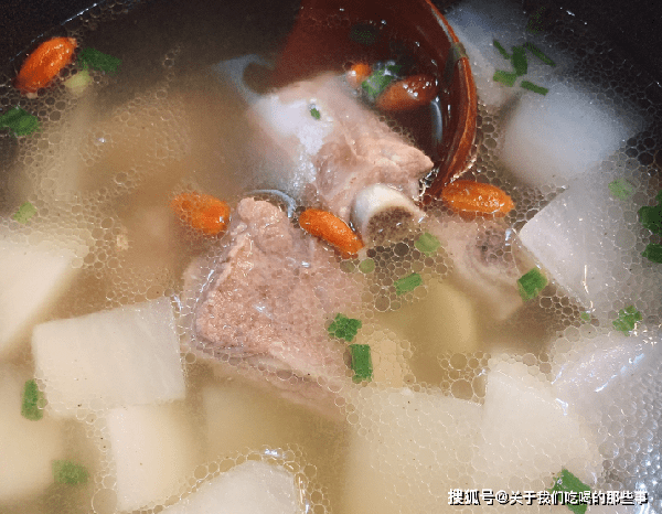 2、把冲洗干净的排骨,加入高过排骨的清水,放几片姜,大火烧开后转小火炖煮40分钟。加入白萝卜,放适量盐,继续炖20分钟,最后加入枸杞、白胡椒粉炖10分钟,即可出锅。