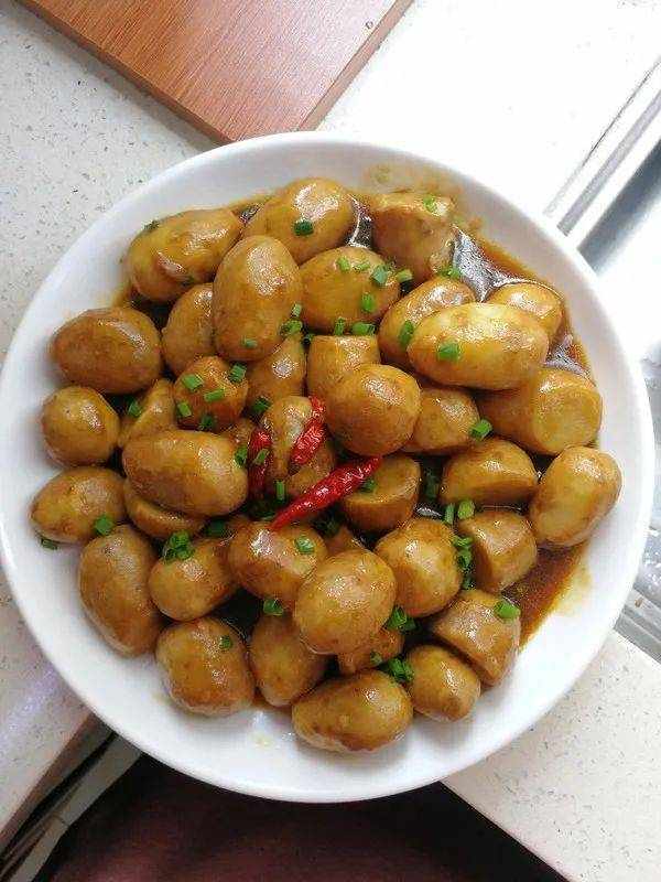 10 倒入芋头不断翻炒,使均匀地裹上酱汁,装出撒上葱花。