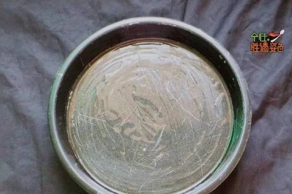 4、静置30分钟的米浆,倒掉上面的清水,不要都倒光,留少许,否则剩余的面浆就太稠了。面浆舀一勺入披萨盘中,转动使其均匀