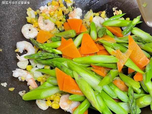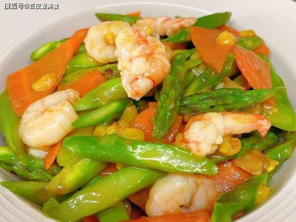 3、起锅烧油,下入葱和蒜爆香,下入虾仁,翻炒片刻,下入玉米粒翻炒,再下入芦笋和胡萝卜片,翻炒片刻,下入盐、蚝油和水淀粉,出锅。