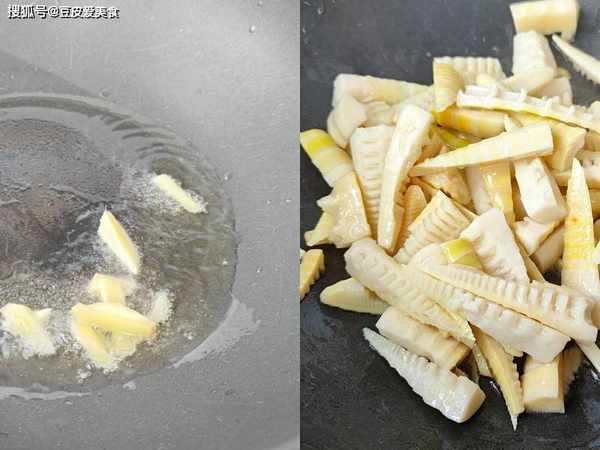 3、起锅烧油,油稍微多一点,下入姜片翻炒一下,再下入笋,翻炒2分钟左右。