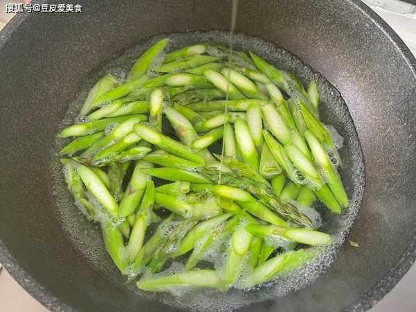 2、锅里烧开水,下入芦笋段,焯煮30秒,再滴入少许橄榄油,下入胡萝卜片,一起焯煮20秒,捞出,沥干水分。