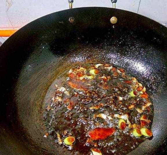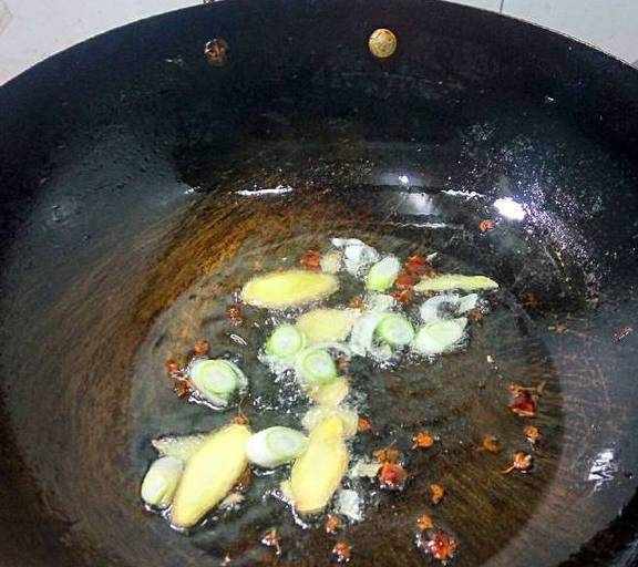 3锅内放入底油,先加八角花椒炸一下,然后再放入葱姜片炒出香味!